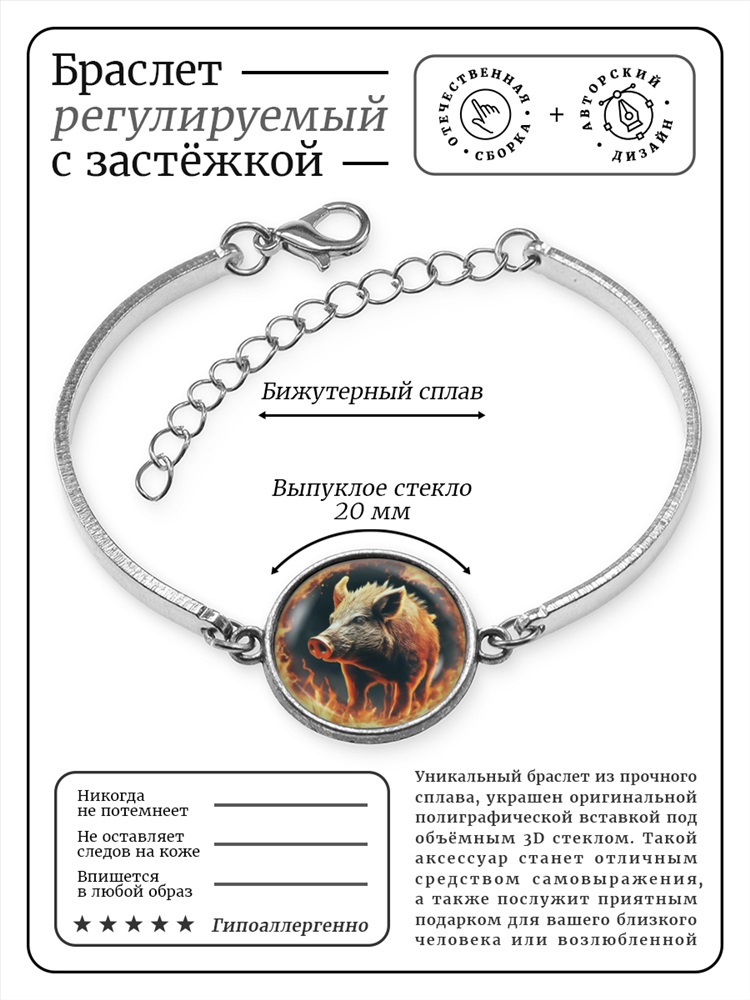 Браслет из бижутерного сплава с регулируемой по длине застёжкой. Изображение диаметром 20 мм прикрыто выпуклой стеклянной линзой. Товар упакован в прозрачный пакет. Без описания.