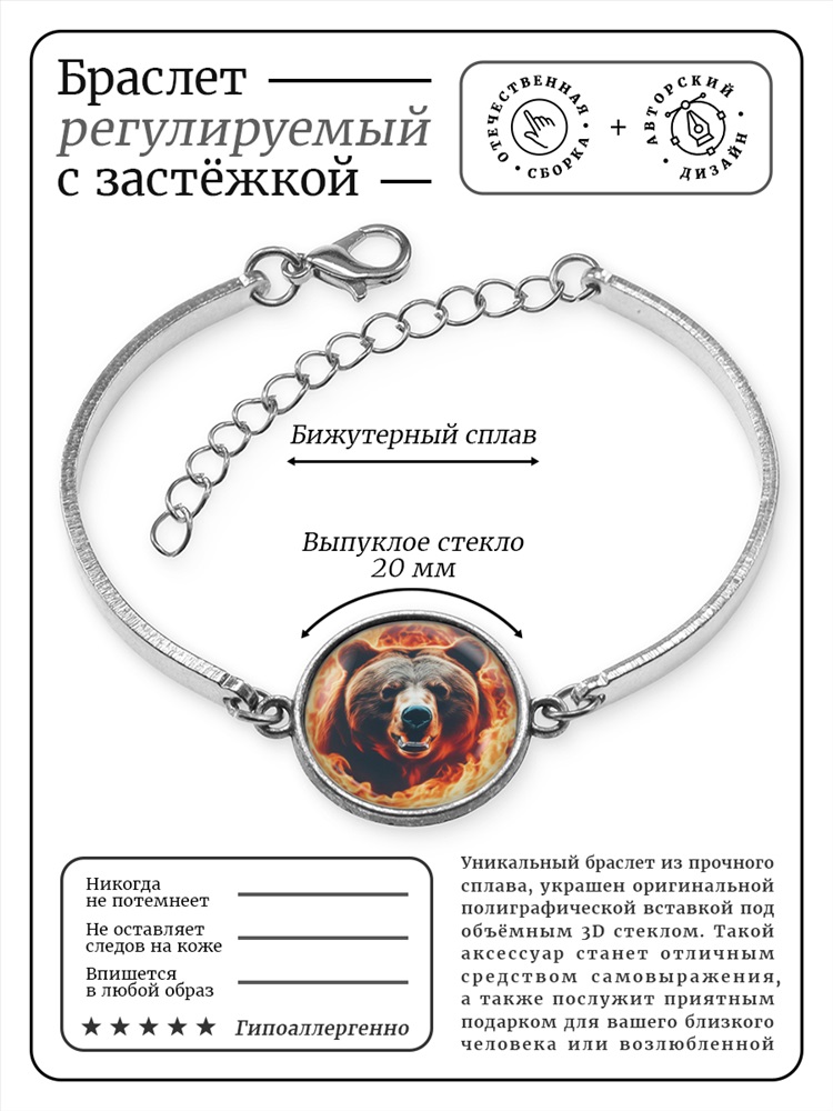 Браслет из бижутерного сплава с регулируемой по длине застёжкой. Изображение диаметром 20 мм прикрыто выпуклой стеклянной линзой. Товар упакован в прозрачный пакет. Без описания.