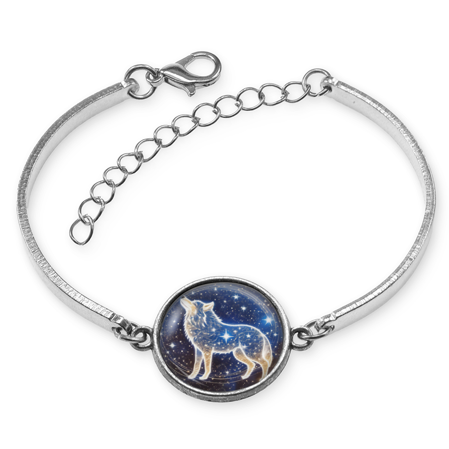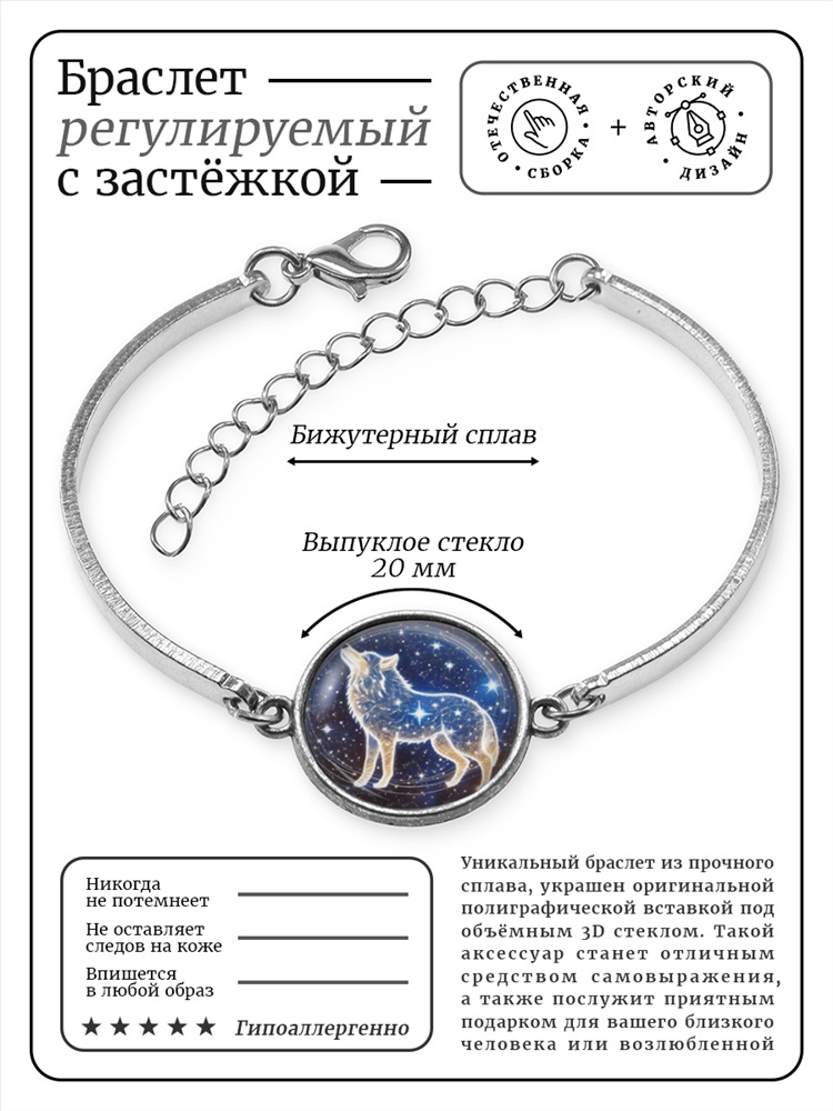 Браслет из бижутерного сплава с регулируемой по длине застёжкой. Изображение диаметром 20 мм прикрыто выпуклой стеклянной линзой. Товар упакован в прозрачный пакет. Без описания.