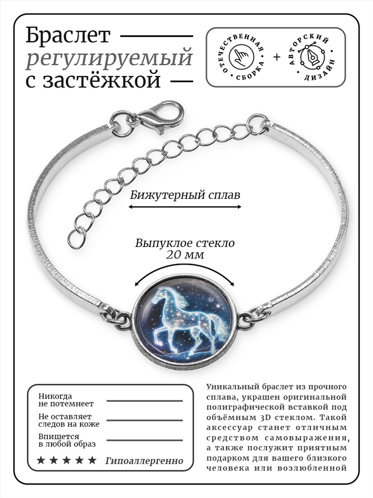 Браслет из бижутерного сплава с регулируемой по длине застёжкой. Изображение диаметром 20 мм прикрыто выпуклой стеклянной линзой. Товар упакован в прозрачный пакет. Без описания.