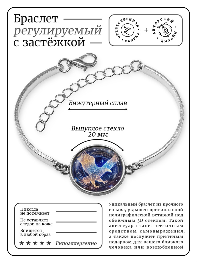 Браслет из бижутерного сплава с регулируемой по длине застёжкой. Изображение диаметром 20 мм прикрыто выпуклой стеклянной линзой. Товар упакован в прозрачный пакет. Без описания.