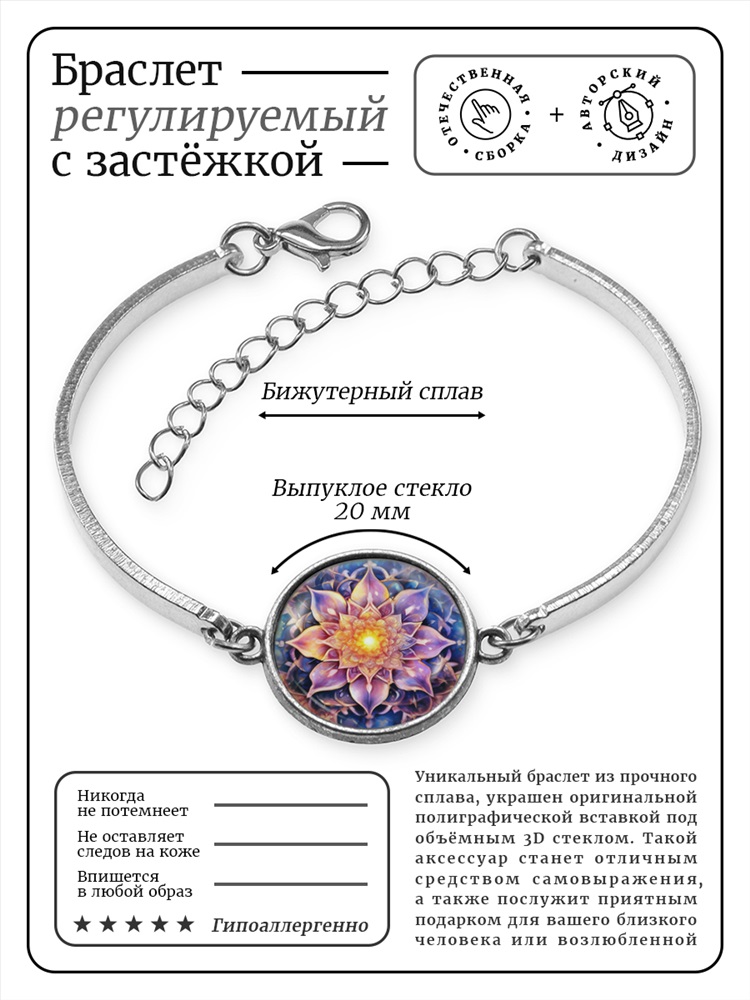 Браслет из бижутерного сплава с регулируемой по длине застёжкой. Изображение диаметром 20 мм прикрыто выпуклой стеклянной линзой. Товар упакован в прозрачный пакет. Без описания.