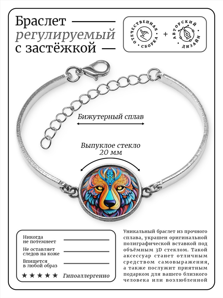 Браслет из бижутерного сплава с регулируемой по длине застёжкой. Изображение диаметром 20 мм прикрыто выпуклой стеклянной линзой. Товар упакован в прозрачный пакет. Без описания.