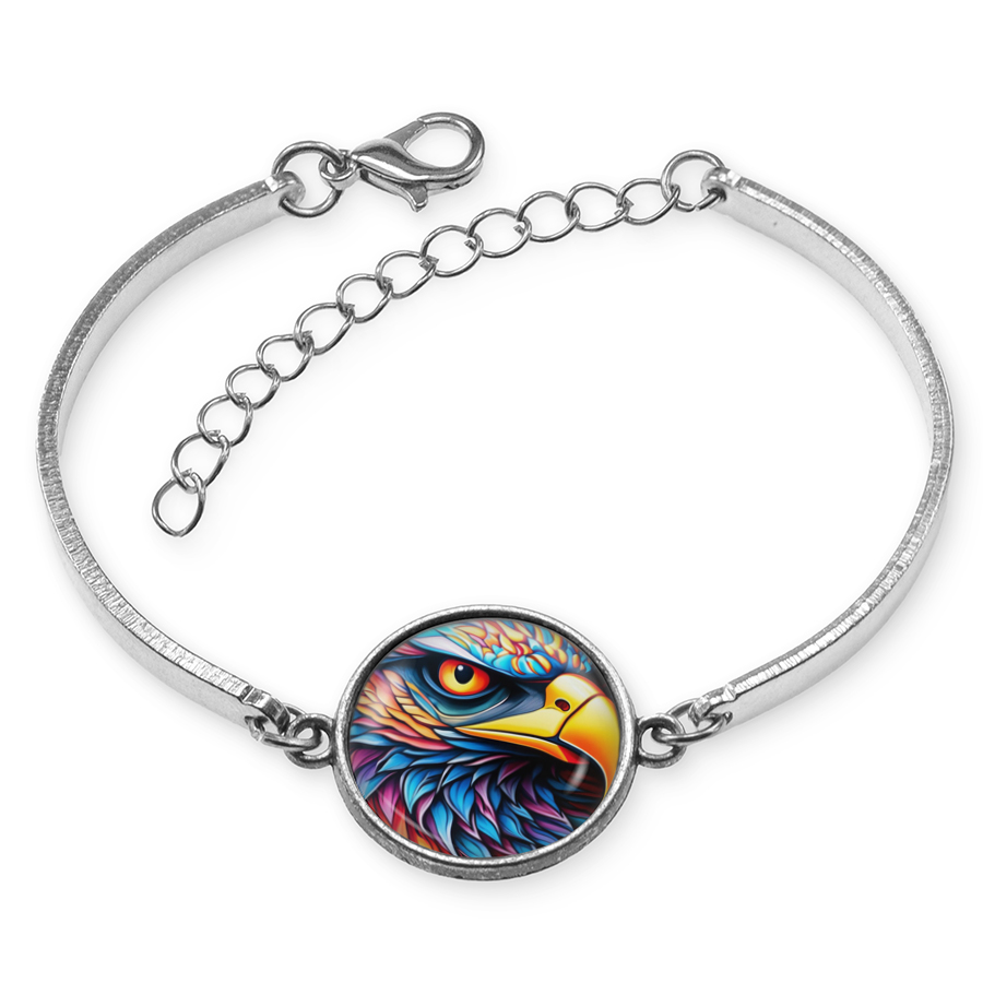 Браслет из бижутерного сплава с регулируемой по длине застёжкой. Изображение диаметром 20 мм прикрыто выпуклой стеклянной линзой. Товар упакован в прозрачный пакет. Без описания.