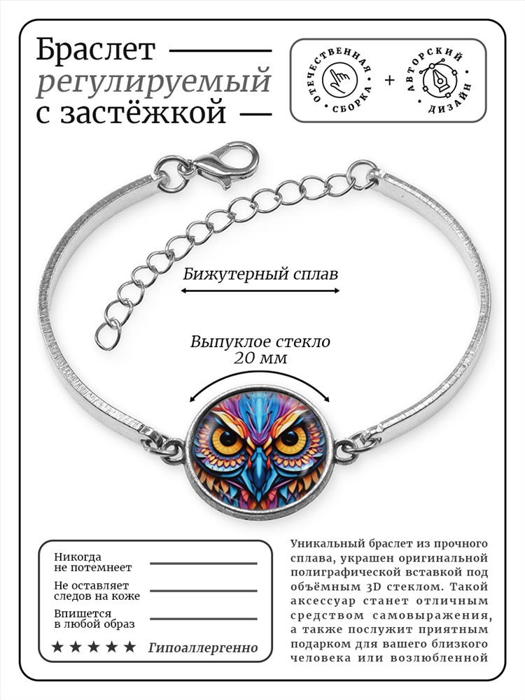 Браслет из бижутерного сплава с регулируемой по длине застёжкой. Изображение диаметром 20 мм прикрыто выпуклой стеклянной линзой. Товар упакован в прозрачный пакет. Без описания.