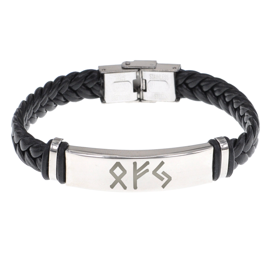 Плетёный кожаный браслет с рунической формулой.