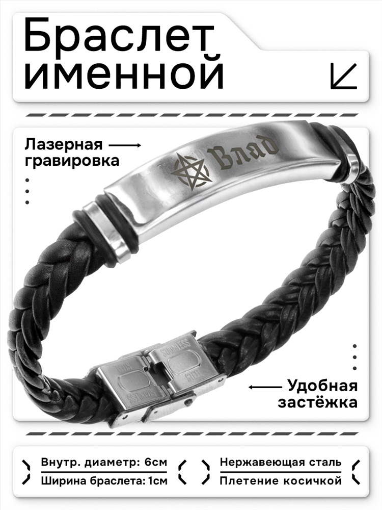 Плетёный кожаный браслет с именной гравировкой. Внутренний диаметр 6 см, длина 20,5 см, ширина 1 см. Материал: кожа, нержавеющая сталь.
