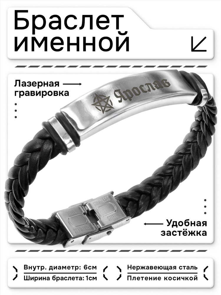 Плетёный кожаный браслет с именной гравировкой. Внутренний диаметр 6 см, длина 20,5 см, ширина 1 см. Материал: кожа, нержавеющая сталь.
