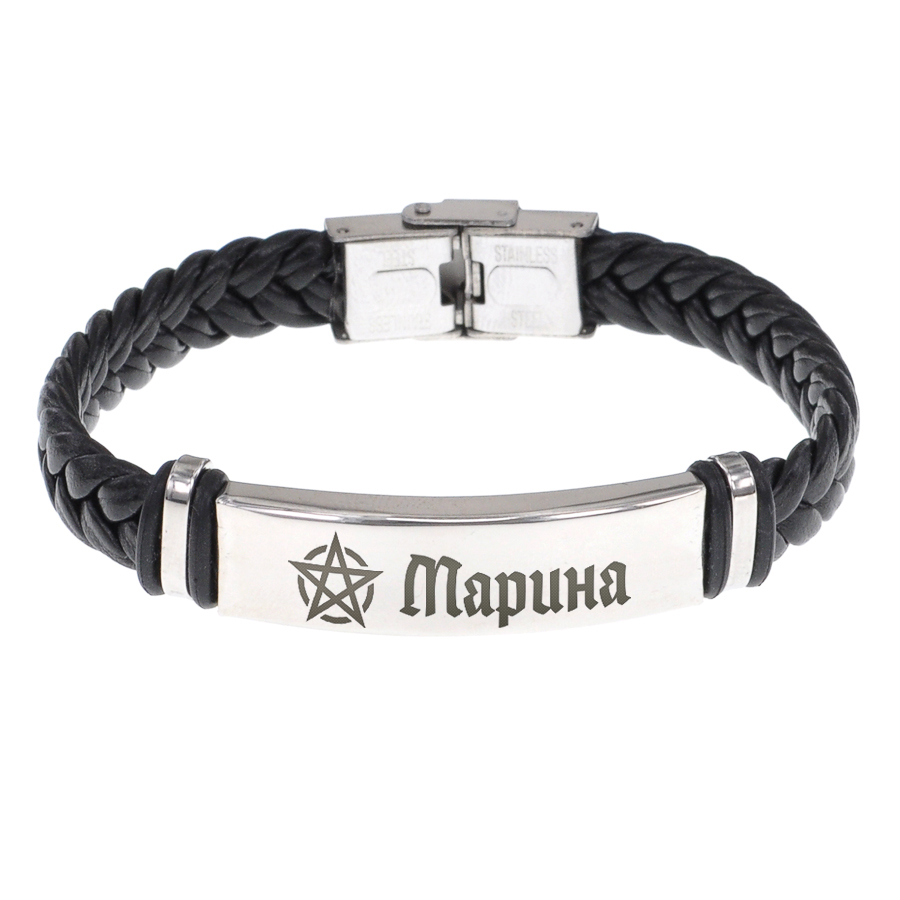 Плетёный кожаный браслет с именной гравировкой. Внутренний диаметр 6 см, длина 20,5 см, ширина 1 см. Материал: кожа, нержавеющая сталь.
