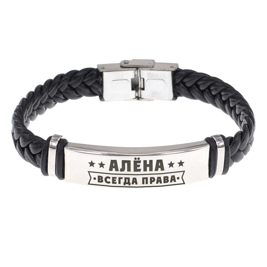 Плетёный кожаный браслет с именной гравировкой Всегда Права. Внутренний диаметр 6 см, длина 20,5 см, ширина 1 см. Материал: кожа, нержавеющая сталь.