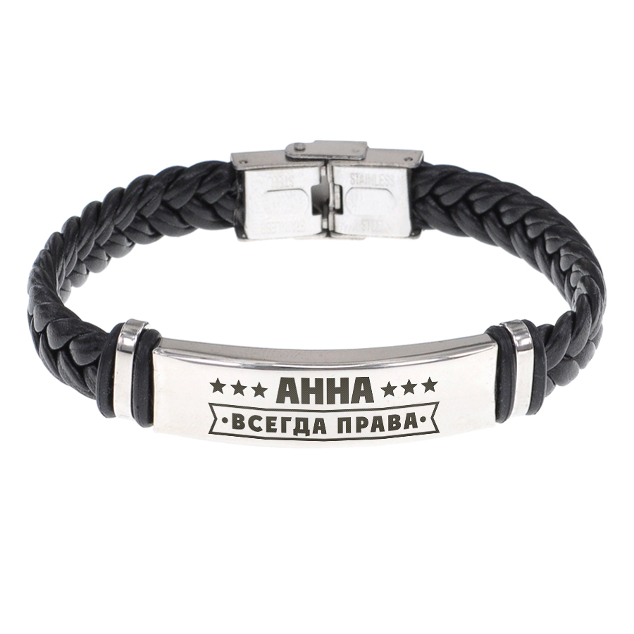 Плетёный кожаный браслет с именной гравировкой Всегда Права. Внутренний диаметр 6 см, длина 20,5 см, ширина 1 см. Материал: кожа, нержавеющая сталь.