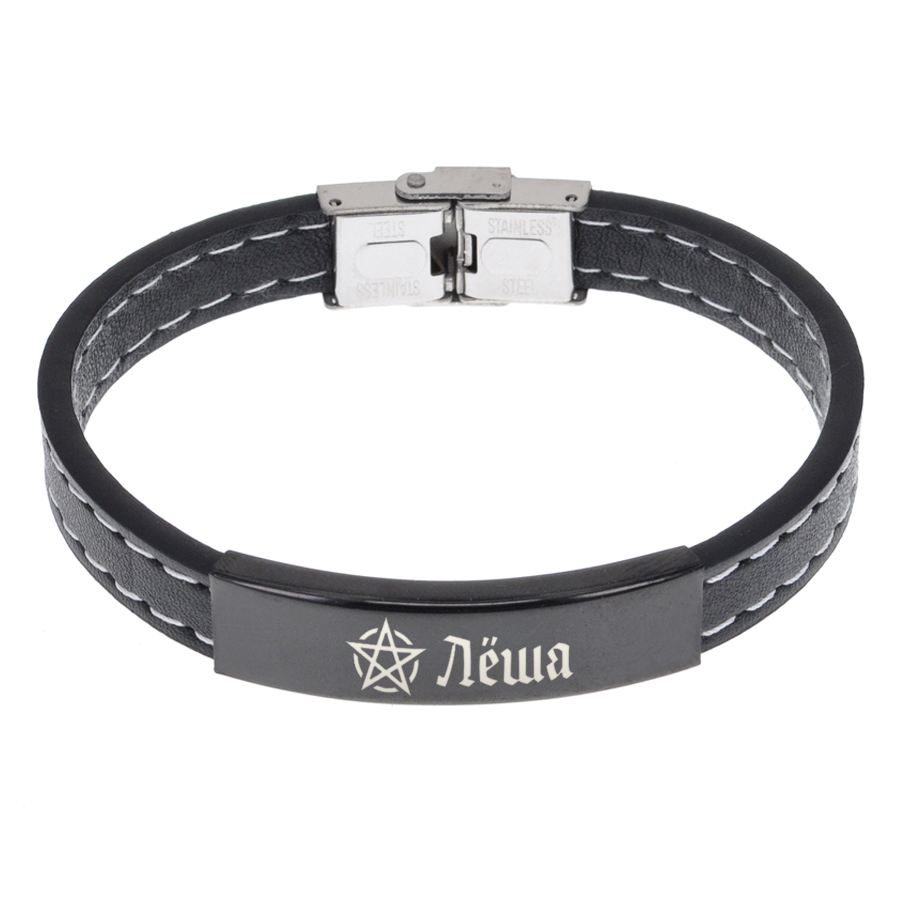 Кожаный браслет с именной гравировкой. Внутренний диаметр 6 см, длина 20,5 см, ширина 1 см. Материал: кожа, нержавеющая сталь.