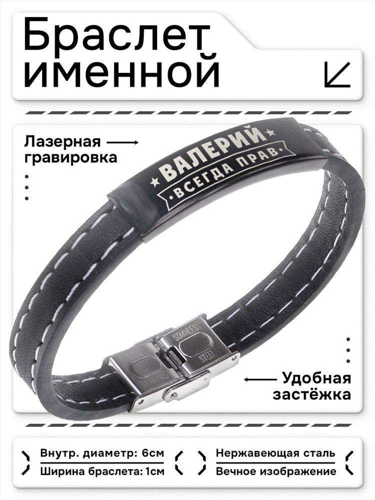 Кожаный браслет с именной гравировкой Всегда Прав. Внутренний диаметр 6 см, длина 20,5 см, ширина 1 см. Материал: кожа, нержавеющая сталь.