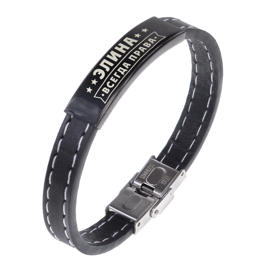Кожаный браслет с именной гравировкой Всегда Права. Внутренний диаметр 6 см, длина 20,5 см, ширина 1 см. Материал: кожа, нержавеющая сталь.