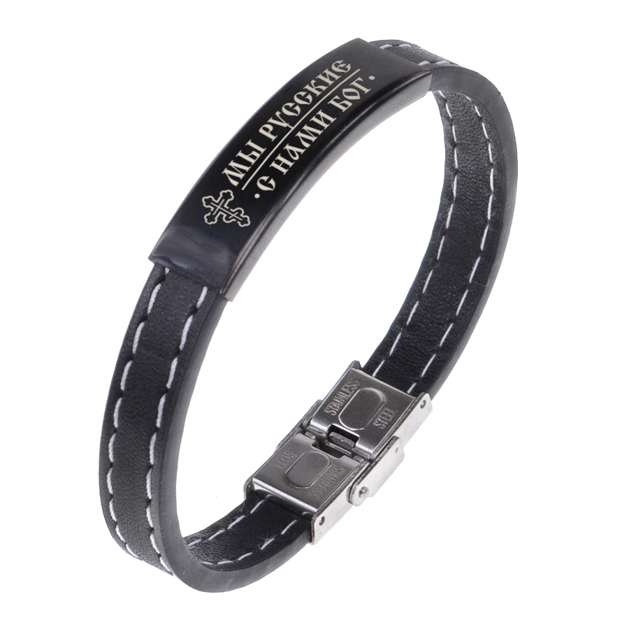 Кожаный браслет с гравировкой Мы русские. Внутренний диаметр 6 см, длина 20,5 см, ширина 1 см. Материал: кожа, нержавеющая сталь.