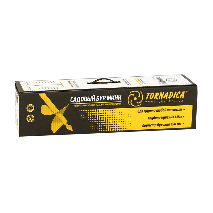 Производитель: TORNADICA; Габариты: 59,5 x 14,5 x 14,5; Страна: Россия; В боксе: 1 шт; Состав: Металл; Материалы: металл; Фасовка: по 1 шт; Индивидуальная упаковка: Цветная картонная коробка; Сертификат: Не подлежит сертификации; Цвет: Жёлтый; Диаметр, мм: 150; Глубина бурения, м: 1