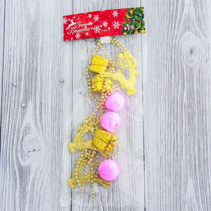 Эти новогодние бусины длиной 1 метр в золотисто-розовых оттенках станут ярким украшением елки и праздничного интерьера. Их универсальный дизайн с изображением подарков, оленей и шариков создаёт тёплую атмосферу зимних праздников и гармонично дополняет любой стиль декора.
