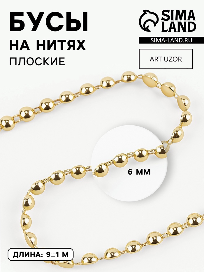 Бусы на нитях, плоские, 6 мм, 9±1 м, цвет золотой