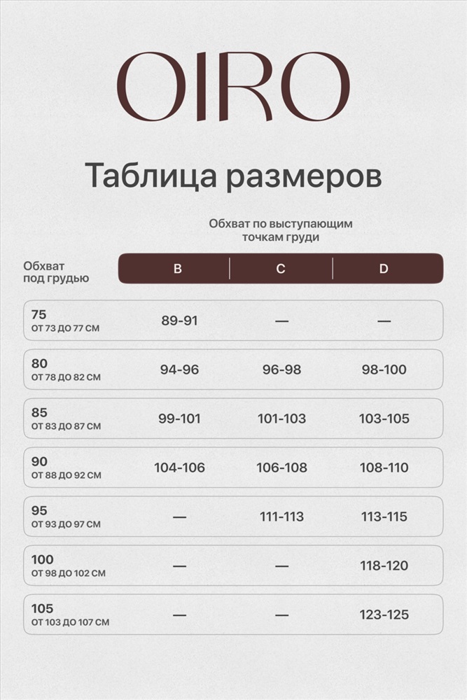 | Размеры | 75B | 80B | 80C | 85B | 85C | 85D | 90B | 90C | 90D | 95C | 95D | 100D | 105D |