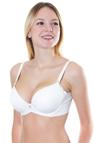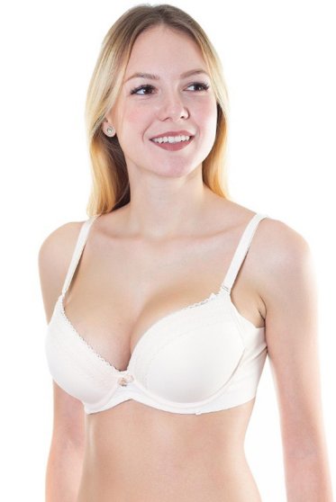 Оптовая продажа. Бюстгальтер с формованными чашками и фигурным "пуш-ап", выполненный из гладкой микрофибры, стан по бокам с бесшовным обрезным краем, на чашках ажурные вставки по верхнему краю, декоративная подвеска в центре, съёмные регулируемые бретели.