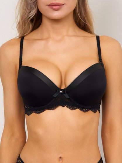 Оптовая продажа. Бюстгальтер с формованными чашками с эффектом "Push-Up", выполненный из гладкого микроволокна в сочетании с нежным кружевом, на чашках отделка декоративной репсовой лентой, декор - атласный бантик с кристаллом, съёмные регулируемые бретели. Размер чашки данной модели B (указан в конце артикула).