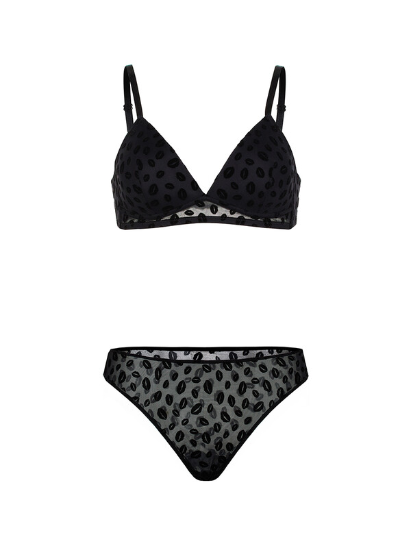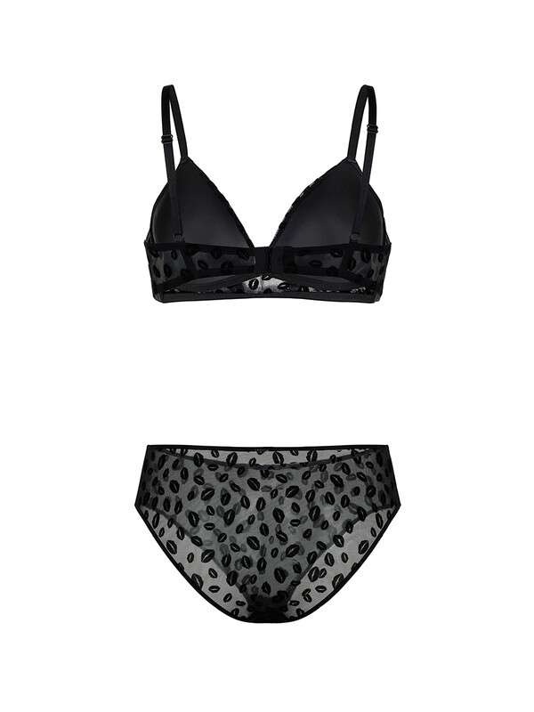 Бюстгалтер Padded Triangle выполнен из мягкой сетки с флок-принтом "поцелуй" на формованной черной чашке triangle без push-up, без каркасов и без боковых корсетных вставок..Бретели регулируются по длине и не отстегиватся. Ширина бретелей на объемы 70, 75 и 80 см с чашками А,В,С - 10мм. Застежка на два крючка и три ряда петель