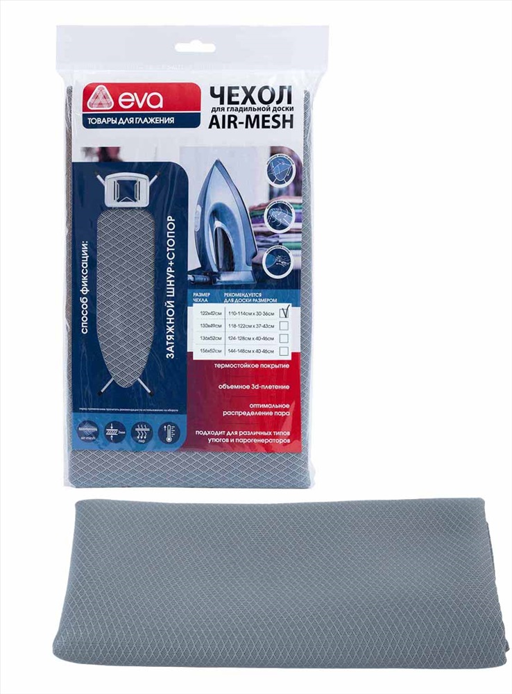 3-1./Размер- / изделия, ШхГхВ, ДхШ, Д, Ш, В: р-р чех 122х42см, р-р дос 114х36см Полное наименование: Чехол для гладильной доски "Air-Mesh", термостойкий, 122х42см, серый Бренд: Eva Честный знак: Нет Количество в упаковке: С.К.10 Вес коробки: 2.39 Вес: 0.21 Объем: 0.0356 м3