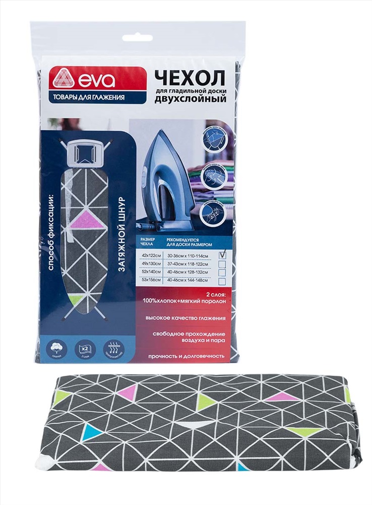 3-1./Размер- / изделия, ШхГхВ, ДхШ, Д, Ш, В: р-р чех 122х42см, р-р дос 114х36см Полное наименование: Чехол для гладильной доски, хлопок, 122х42см, "Серые треугольники" Бренд: Eva Честный знак: Нет Количество в упаковке: М.К.8 Вес коробки: 1.025 Вес: 0.105 Объем: 0.0191 м3