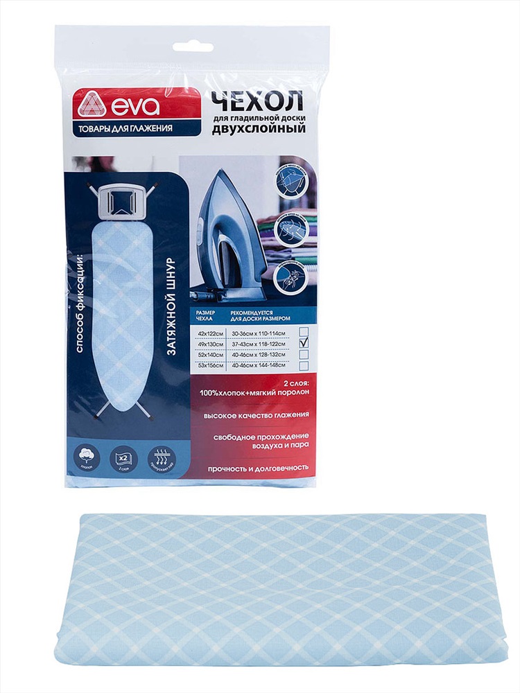 3-1./Размер- / изделия, ШхГхВ, ДхШ, Д, Ш, В: р-р чех 130х49см, р-р дос 122х42см Полное наименование: Чехол для гладильной доски, хлопок, 130х49см, "Голубая клетка" Бренд: Eva Честный знак: Нет Количество в упаковке: М.К.6 Вес коробки: 0.905 Вес: 0.12 Объем: 0.0191 м3