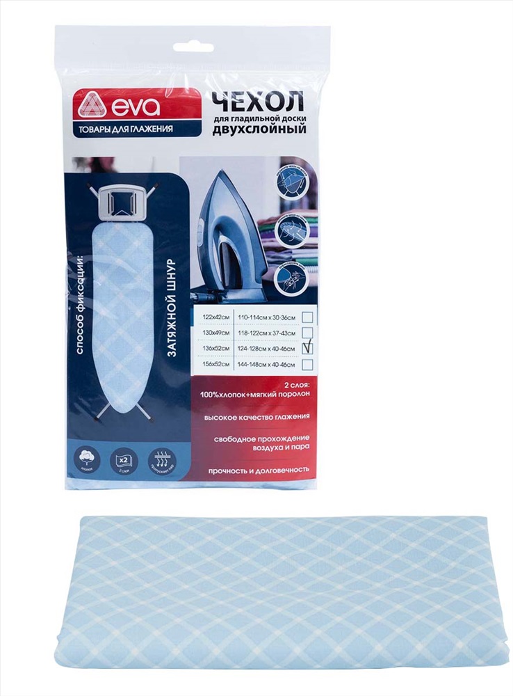 3-1./Размер- / изделия, ШхГхВ, ДхШ, Д, Ш, В: р-р чех 136х52 см, р-р дос 128х46 см Полное наименование: Чехол для гладильной доски, хлопок, 136х52см, "Голубая клетка" Бренд: Eva Честный знак: Нет Количество в упаковке: С.К.10 Вес коробки: 1.81 Вес: 0.152 Объем: 0.0356 м3