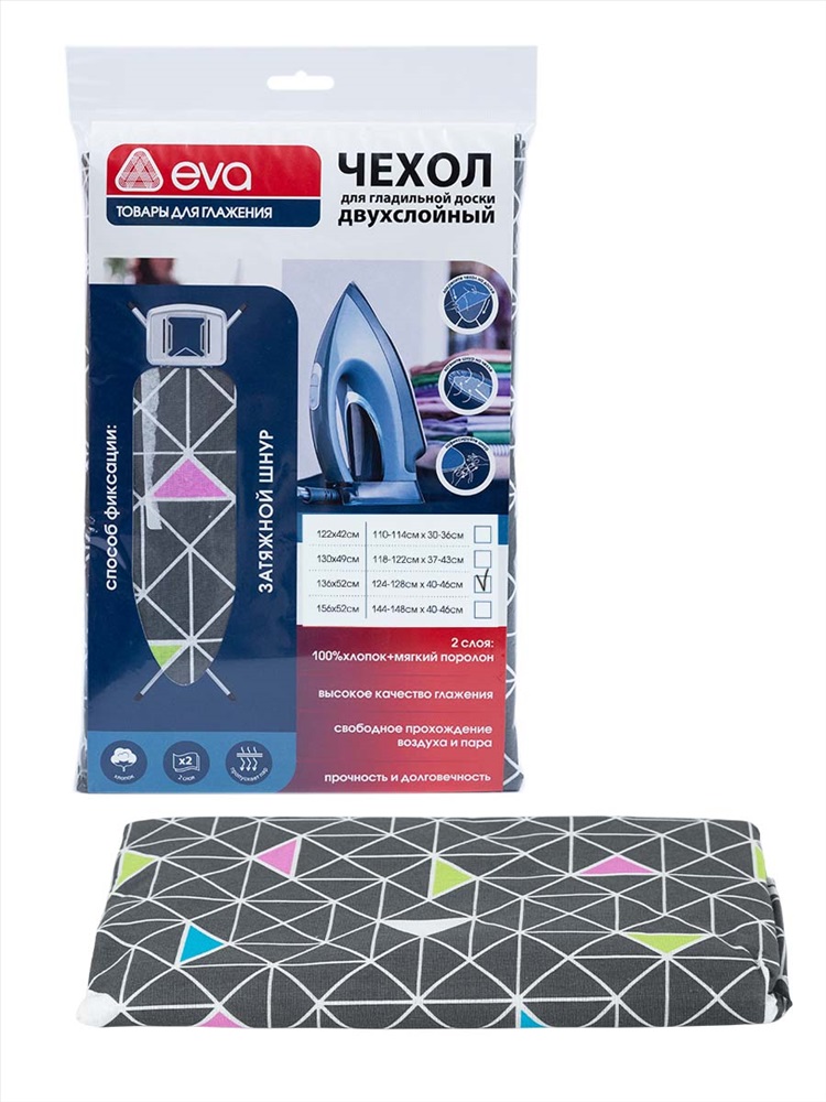 Полное наименование: Чехол для гладильной доски, хлопок, 136х52см, "Серые треугольники" Бренд: Eva Честный знак: Нет Количество в упаковке: С.К.10 Вес коробки: 1.81 Вес: 0.152 Объем: 0.0356 м3 ОписаниеКлассический чехол для гладильной доски "Серые треугольники" сделан в России из бязевого хлопка.В качестве подкладки используется поролон толщиной 2 мм. Размер поролона соответствует размеру гладильной доски для оптимального распределения на внешней поверхности гладильной доски, без припусков на нижнюю часть доски. При необходимости, поролон можно уменьшить под размер Вашей гладильной доски, Чехол легко фиксируется на доске с помощью затяжного шнура. Такой чехол поможет за считанные минуты обновить гладильную доску: придать ей аккуратный вид и выровнять поверхность доски. Размер чехла: 136х52см. Для определения подходящего размера чехла для гладильной доски необходимо к параметрам доски добавить 6-12см. Это оптимальный припуск, который обеспечит полное покрытие доски и плотную посадку чехла без избытка ткани. Комментарии к товару