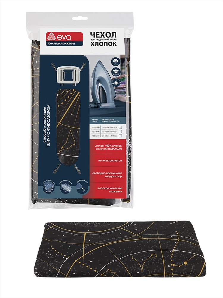 Полное наименование: Чехол для гладильной доски, хлопок, поролон, 122х42см, "Созвездие" Бренд: Eva Честный знак: Нет Похожие товары по фильтру: [] Аксессуары по фильтру: [] Количество в упаковке: М.К.8 Вес коробки: 1.025 Вес: 0.105 Объем: 0.0191 м3 ОписаниеКлассический чехол для гладильной доски "Созвездие" сделан в России из бязевого хлопка. Принт с изображением звездного неба – изысканный и элегантный, создаст уютное настроение и будет радовать глаз каждый раз, когда вы берёте утюг в руки.Чехол - оптимальное решение для обновления внешнего вида, улучшения качественных характеристик и продления срока службы гладильной доски. Верхний слой сделан из 100% хлопка, а нижний - из мягкого поролона толщиной 2 мм. Хлопковый чехол препятствует электризации вещей и не допускает их соскальзывания с поверхности доски. Мягкий поролоновый слой делает поверхность доски ровной и гладкой, а также повышает паропроницаемость. Изделие фиксируется шнуром с фиксатором, который надежно закрепит его по габаритам и контуру доски, исключив сдвигание во время использования. При выборе чехла учитывайте, что его размер должен быть больше размера покрытия доски минимум на 5 см. Рекомендуется менять чехол не реже 1 раза в три года. Перед использованием рекомендуется прополоскать в тёплой воде. С осторожностью утюжить светлые вещи. Комментарии к товару