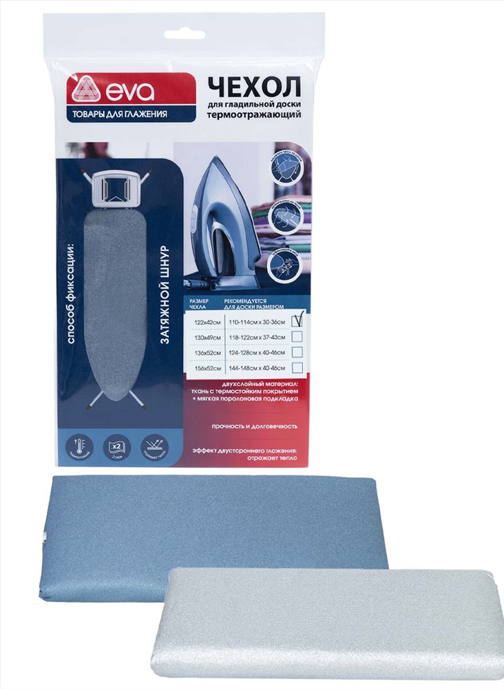 3-1./Размер- / изделия, ШхГхВ, ДхШ, Д, Ш, В: 122х42см Полное наименование: Чехол для гладильной доски с термостойким покрытием, 122х42см Бренд: Eva Честный знак: Нет Количество в упаковке: М.К.8 Вес коробки: 1.145 Вес: 0.13 Объем: 0.0191 м3