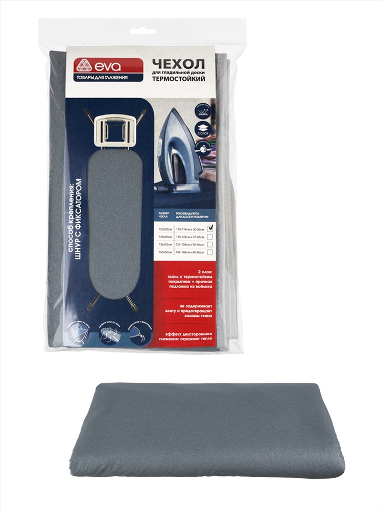 Термостойкий чехол для гладильной доски Еva - оптимальное решение для обновления внешнего вида, улучшения качественных характеристик и продления срока службы Вашей гладильной доски. Цвет серо-голубой.