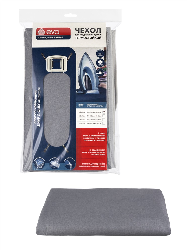 Полное наименование: Чехол для гладильной доски с термостойким покрытием, подложка войлок, 122х42см, серый Бренд: Eva Честный знак: Нет Похожие товары по фильтру: [] Аксессуары по фильтру: [] Количество в упаковке: С.К.12 Вес коробки: 3.2 Вес: 0.26 Объем: 0.0356 м3 ОписаниеТермостойкий чехол для гладильной доски Еva - оптимальное решение для обновления внешнего вида, улучшения качественных характеристик и продления срока службы Вашей гладильной доски.Верхний слой сделан из 100% хлопка с AL-напылением, а нижний выполнен из износостойкого белого войлока. Благодаря AL- напылению на хлопке создается оболочка, делающая поверхность чехла антистатичной, влагозащитной и хорошо дышащей. Войлочный уплотнитель равномерно распределяет тепло, является более практичным и долговечным, препятствует скоплению влаги в чехле, обеспечивает быструю глажку и плавное скольжение утюга. Термостойкий чехол отражает тепло с поверхности доски и повышает качество глажения. Изделие фиксируется шнуром с фиксатором, который надежно закрепит его по габаритам и контуру доски, исключив сдвигание во время использования. При выборе чехла учитывайте, что его размер должен быть больше размера покрытия доски минимум на 5 см. Рекомендуется менять чехол не реже 1 раза в три года. Перед использованием рекомендуется прополоскать в тёплой воде. С осторожностью утюжить светлые вещи Комментарии к товару