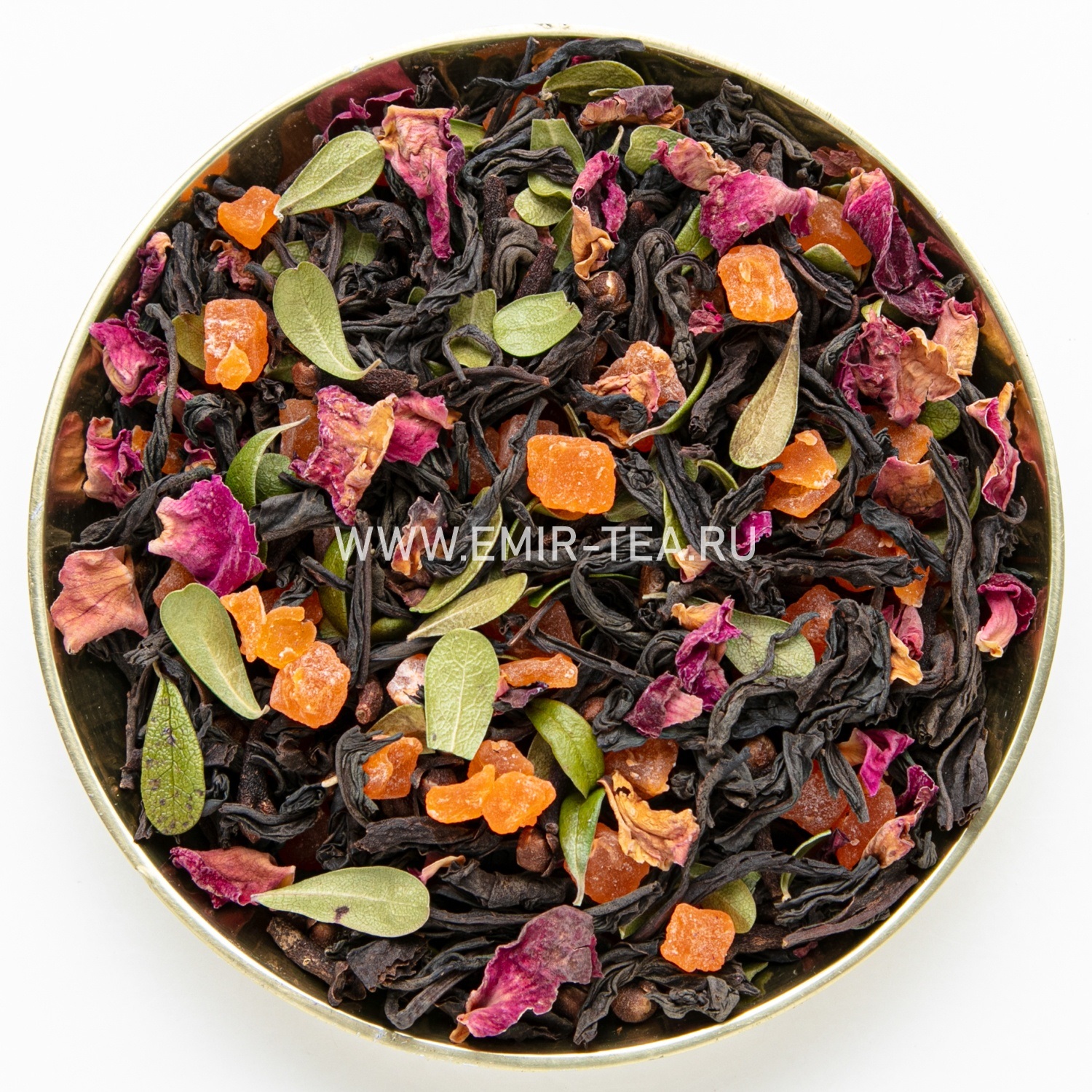 Состав: Индийский черный байховый чай, цукаты манго, цукаты папайя, цукаты ананаса, лепестки розы, лист брусники. Содержит пищевые ароматические масла.