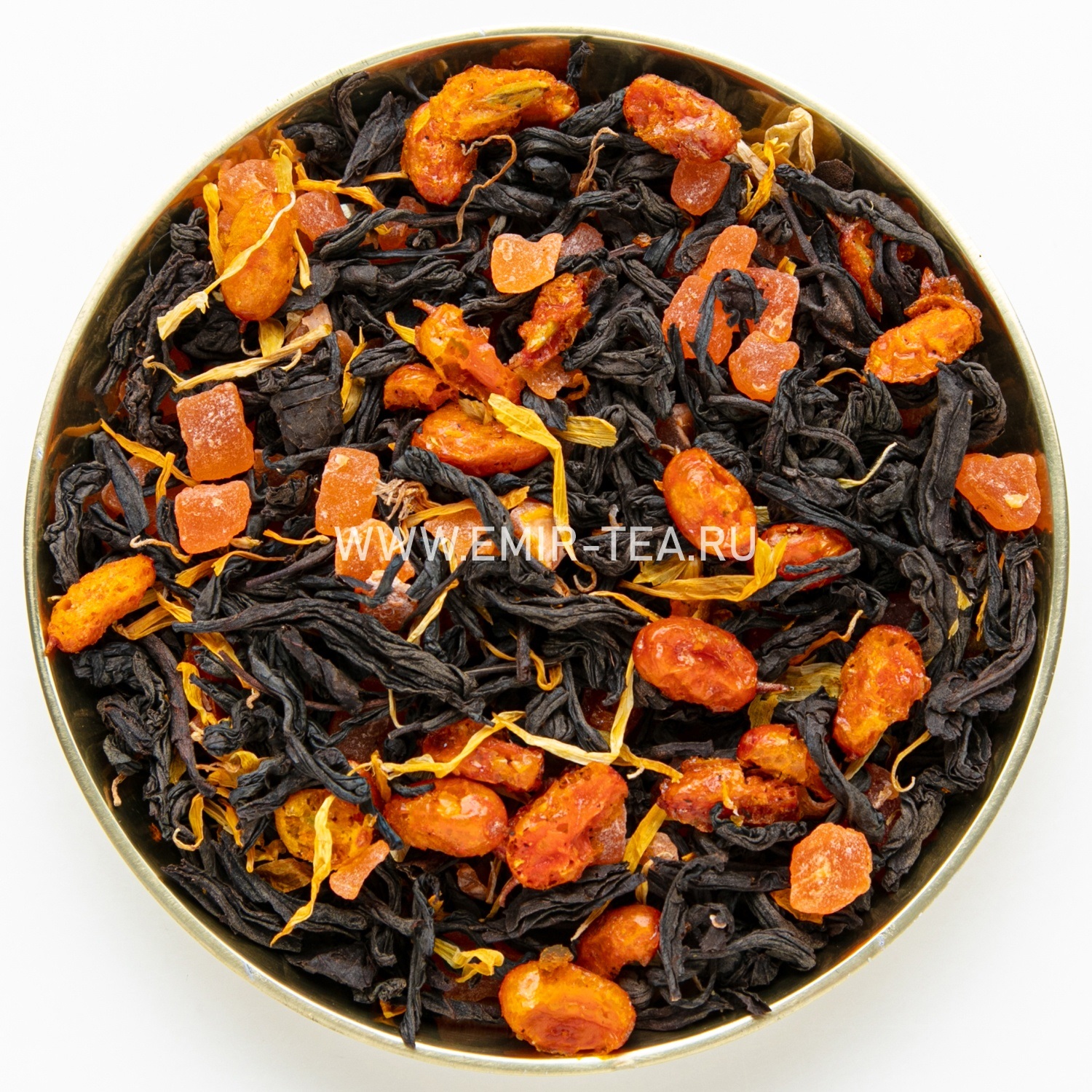 Состав: Индийский черный байховый чай, лист клубники, цукаты папайя, календула, сублимированная облепиха. Содержит пищевые ароматические масла.