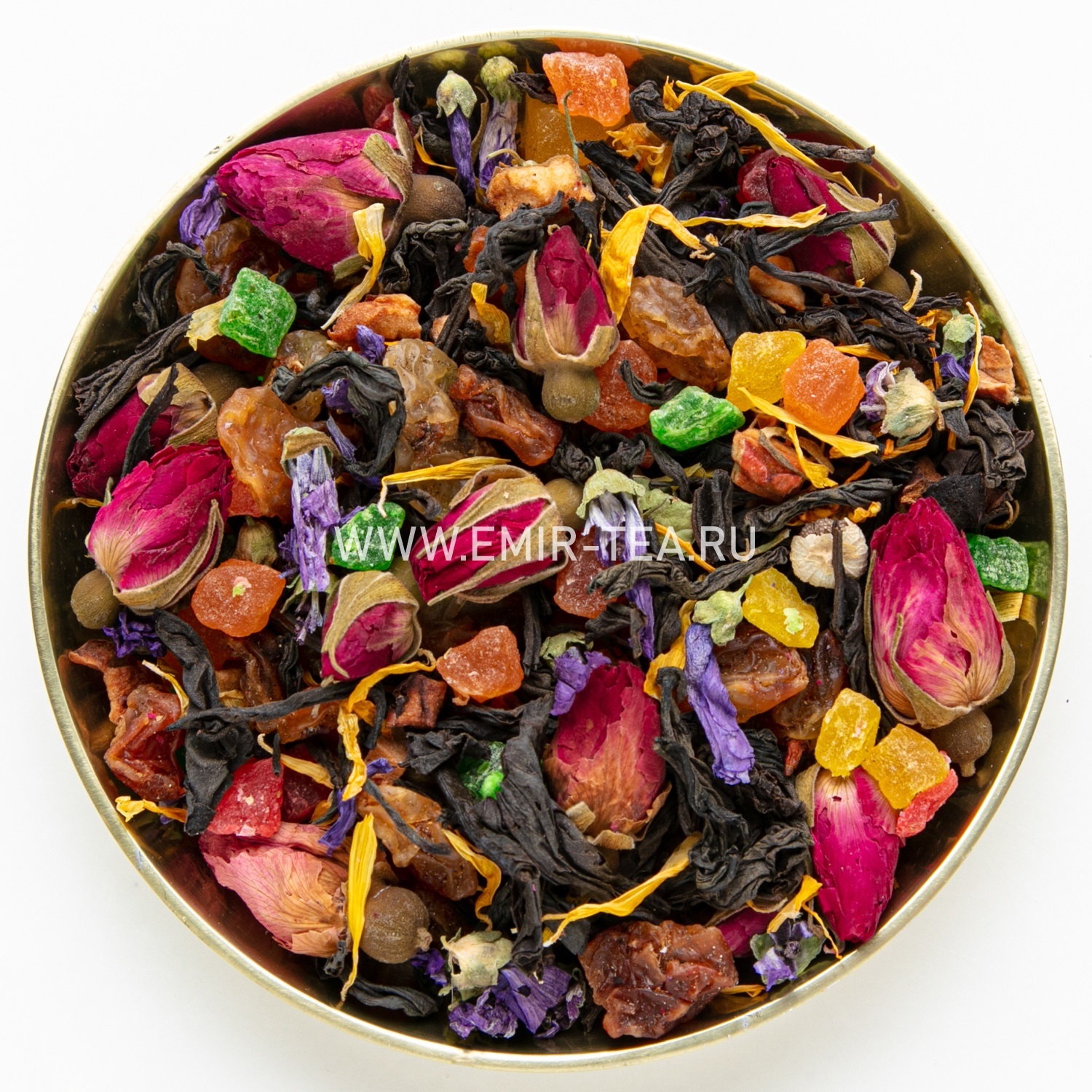 Состав: Купаж на основе байхового черного чая с добавлением изюма, кусочков сушеного яблока, лепестков розы,календулы и мальвы сушеной вишни. Содержит пищевые ароматические масла. Не содержит ГМО.