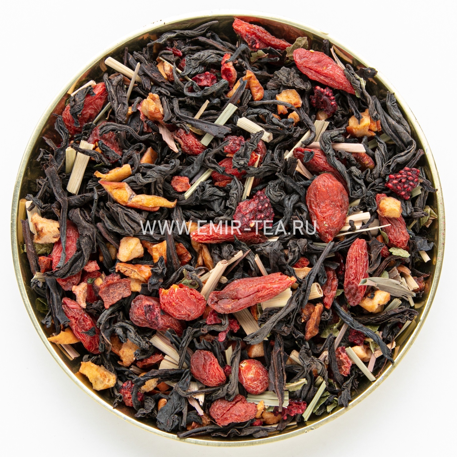 Состав: Индийский черный байховый чай, ягоды годжи, садовая земляника, лимонная трава, кусочки сушеного яблока. Содержит пищевые ароматические масла.