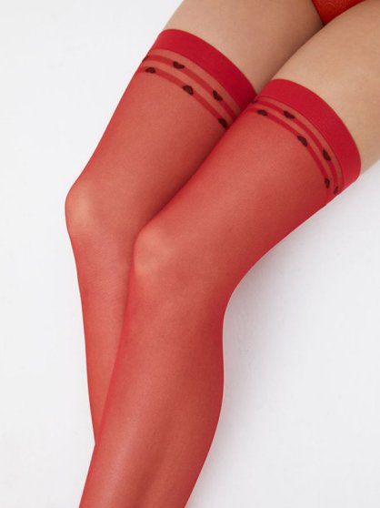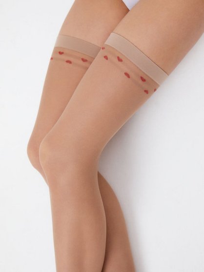 Оптовая продажа. Тонкие эластичные чулки под пояс с широкой гладкой каймой для крепления застежек пояса, под каймой рисунок, тонкие полоски с сердечками, невидимый усиленный мысок. Формованная ступня.