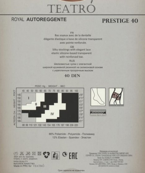 Производитель: Teatro Оптовая продажа. Чулки шелковистые с кружевной резинкой (12 см) на силиконовой основе, укреплённый прозрачный мысок. Состав: Плотность: 40ден Лайкра: 12% Полиамид: 88%