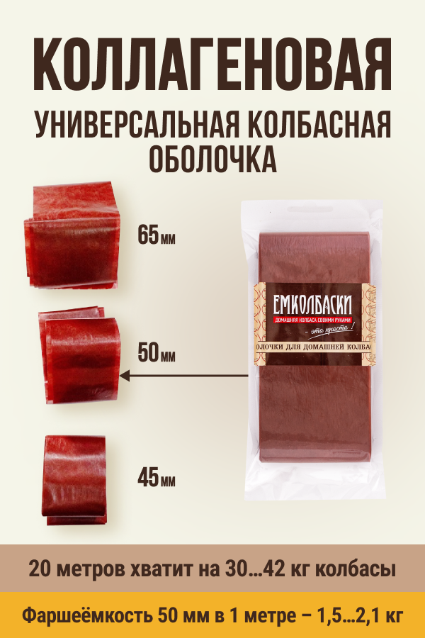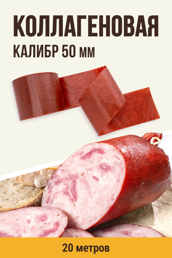 Производитель: "Вискофан СА", Испания; Вид оболочки: коллагеновая оболочка.; Количество в упаковке: 20 метров.; Калибр оболочки: 50 мм.; Фаршеемкость: в 1 м - 1,5...2,1 кг. В 20 метрах этой оболочки поместится от 30 до 42 кг фарша.; Цвет: махагон.; Виды колбас: сервелат, салями, сыровяленная колбаса, краковская, ливерная колбаса, кровяная колбаса, варено-копченая колбаса, копчено-вареная колбаса, сырокопченая колбаса, колбасы в плесени.; Способ приготовления: варка, запекание, копчение, вяление.; Температурный режим приготовления: первые 20 мин. – не выше 70 град., далее макс 75-80 град. Охлаждение- сразу после термообработки холодной водой до 22-25 град.; Подготовка к набивке: несъедобная. Замочить на 10-15 минут в теплой воде (37-40 град.) для придания эластичности. В течение 30 мин. использовать. Повторное замачивание недопустимо.; Условия и сроки хранения: при t = 5…23 град. и отн.влажности 60…65% - 24мес.