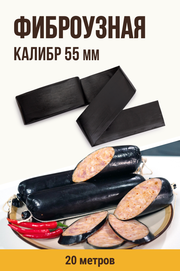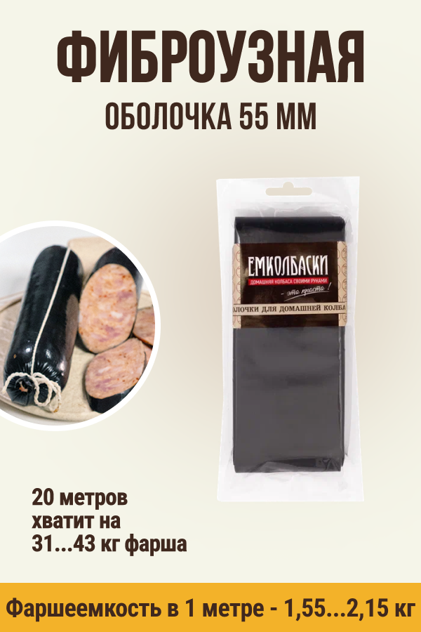 Производитель: ИП Агапкин ПА; Количество в упаковке: 20 метров; Калибр оболочки: 55 мм; Фаршеемкость: в 1 м - 1,55...2,15 кг. В 20 метрах этой оболочки поместится от 31 до 43 кг фарша.; Цвет: чёрный; Виды колбас: универсальная оболочка, подходит для всех видов колбас, кроме жареных и гриль; Способ приготовления: варка, копчение, вяление; Подготовка к набивке: замочить на 5-10 минут в теплой воде (37...40 град.) для придания эластичности; Условия и сроки хранения: при t = +15…25 град. и влажности 65…75% - 24 мес.