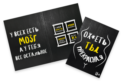 Наполнение: Внутри открытки 4 вкуснейшие молочные плитки шоколада по 5гр. размером 31х31мм. Каждая завернута в индивидуальную упаковку под тематику открытки. Состав- сахар, какао масло, сухое цельное молоко, какао тертое, эмульгатор соевый лецитин, натуральный ароматизатор ваниль.