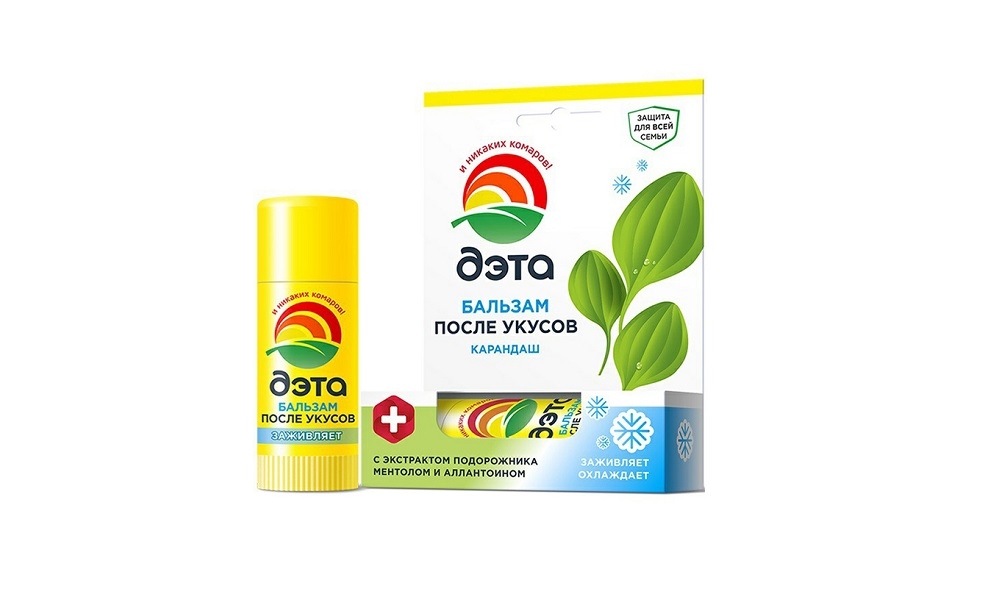 Эффективно снимает зуд и болевые ощущения после укусов насекомых, ожогов крапивы и медуз. Уменьшает отечность, способствует исчезновению покраснения. Благодаря экстракту подорожника, бальзам обладает противовоспалительными и заживляющими свойствами. Аллантоин успокаивает кожу, а ментол дает приятный охлаждающий эффект.