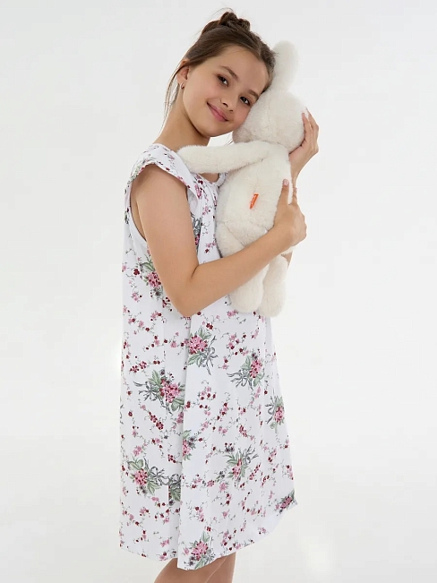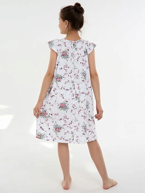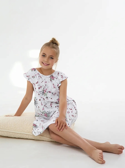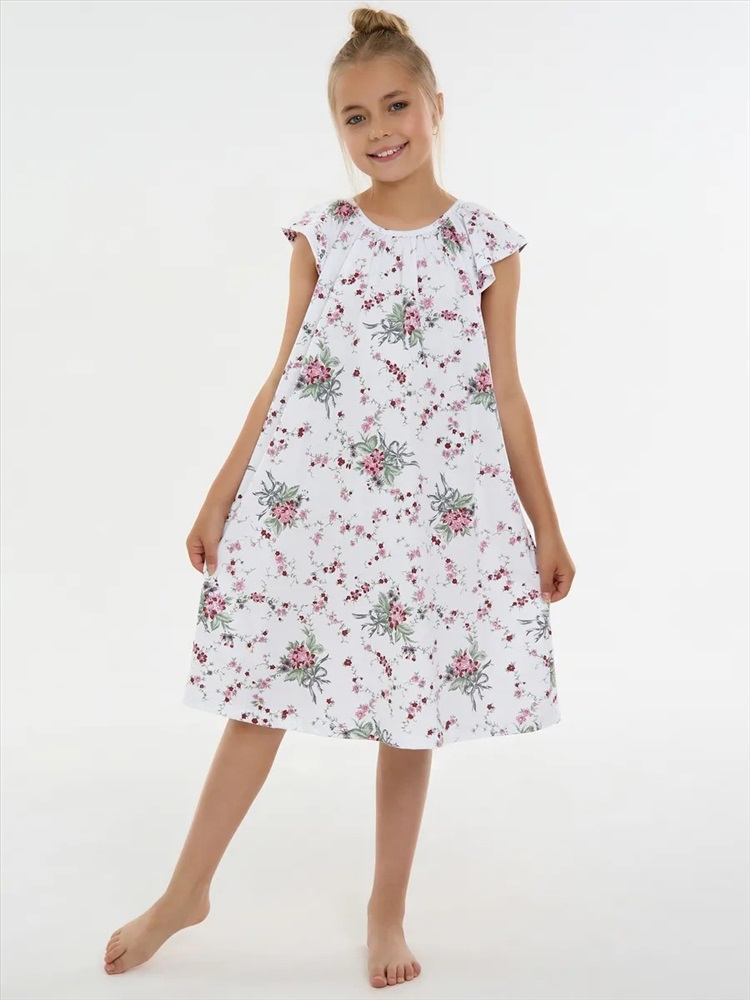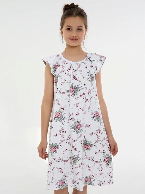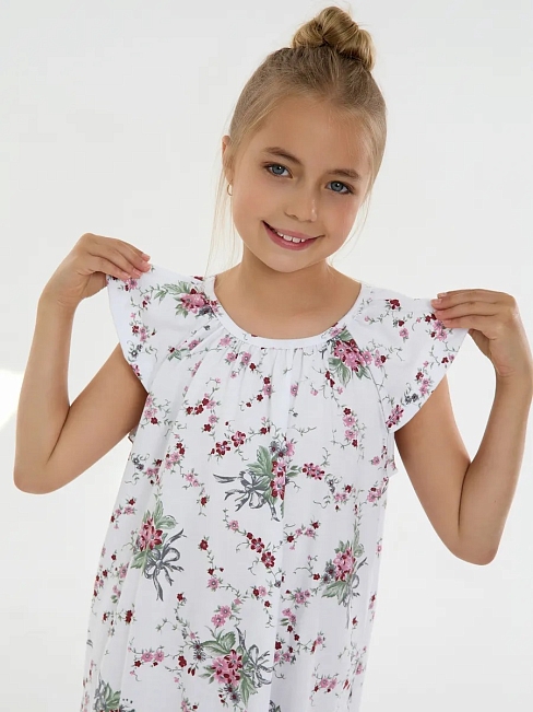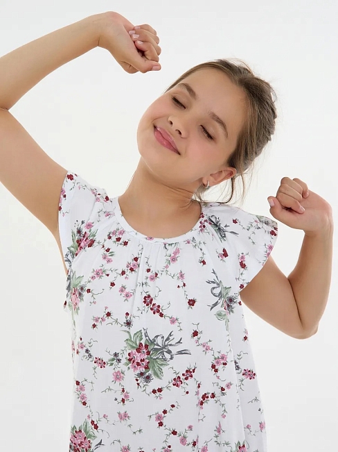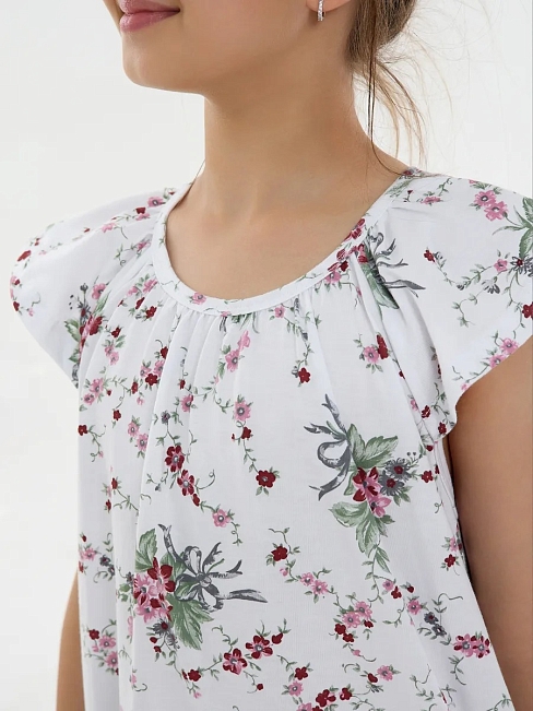 Материал: Кулирка; Состав: 100% хлопок; Застежка: Без застежки; Длина рукава: Короткий рукав; Размерный ряд: 116-158; Цвет: Белый; Тип рисунка: Растения; Пол: Девочка