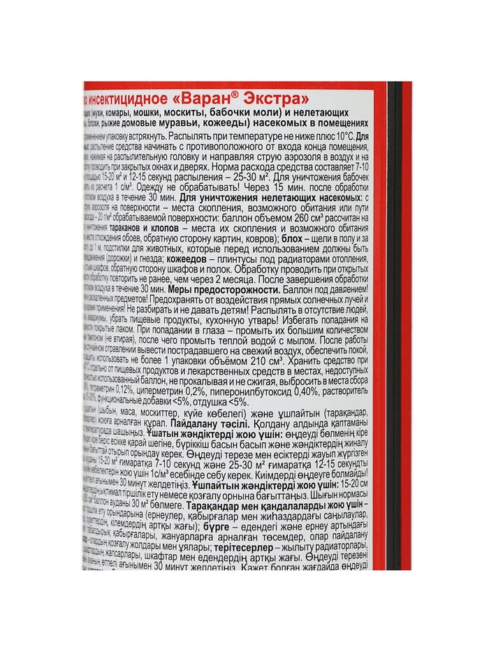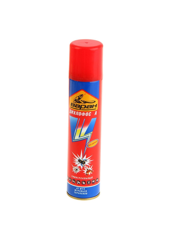 На природе и дома многие люди сталкиваются с клещами, клопами, москитами и другими опасными насекомыми, которые способны причинить массу вреда. Они переносят инфекцию, пьют вашу кровь и просто раздражают своим внешним видом. Вы устали бороться с ними? Дихлофос от торговой марки «Варан» — высокоэффективное средство для уничтожения ползающих (тараканов, муравьёв, клопов и т. д.), а также летающих насекомых (мух, москитов, комаров). Способ применения: перед использованием хорошо взболтайте, распылите. Состав: тетраметрин 0,12 %, циперметрин 0,2 %, пиперонилбутоксид 0,4 %, отдушка менее 5 %, функциональные добавки менее 5 %, смесь бутан / пропан / изобутан более 30 %, растворители более 30 %. Способ применения: перед использованием хорошо взболтайте, распылите.