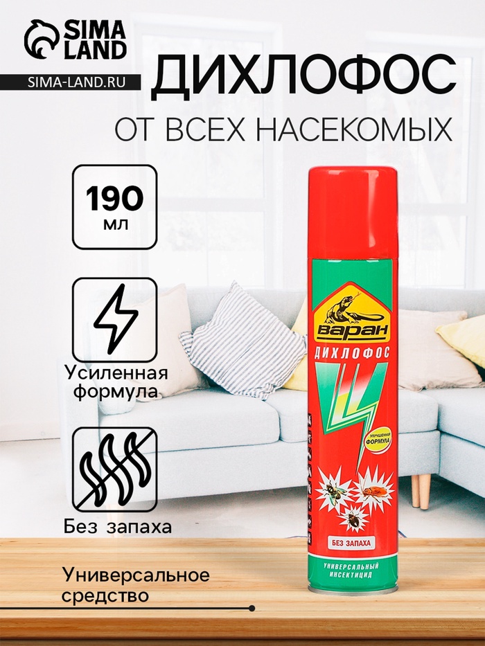 На природе и дома многие люди сталкиваются с клещами, клопами, москитами и другими опасными насекомыми, которые способны причинить массу вреда. Они переносят инфекцию, пьют вашу кровь и просто раздражают своим внешним видом. Вы устали бороться с ними? Дихлофос от торговой марки «Варан» — высокоэффективное средство для уничтожения ползающих (тараканов, муравьёв, клопов и т. д.), а также летающих насекомых (мух, москитов, комаров). Способ применения: перед использованием хорошо взболтайте, распылите. Состав: тетраметрин 0,12 %, циперметрин 0,2 %, пиперонилбутоксид 0,4 %, отдушка менее 5 %, функциональные добавки менее 5 %, смесь бутан / пропан / изобутан более 30 %, растворители более 30 %. Способ применения: перед использованием хорошо взболтайте, распылите.