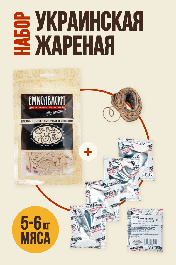 2. Смесь приправ «для Украинской жареной» - 20 г ( 5 шт). Эта колбаса высшего сорта считалась достаточно дорогой в Советском Союзе (ГОСТ 16351), потому что при термообработке она сильно "ужаривалась" и выход ее был примерно 60-70. Такая колбаса могла достаточно долго храниться и была удобна в качестве еды в походных условиях.