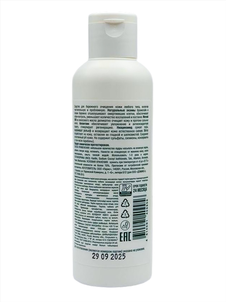 Состав (INCI): Kaolin, Sodium Cocoyl Isethionate, Talc, Allantoin, Bromelain, Papain, Niacinamide.